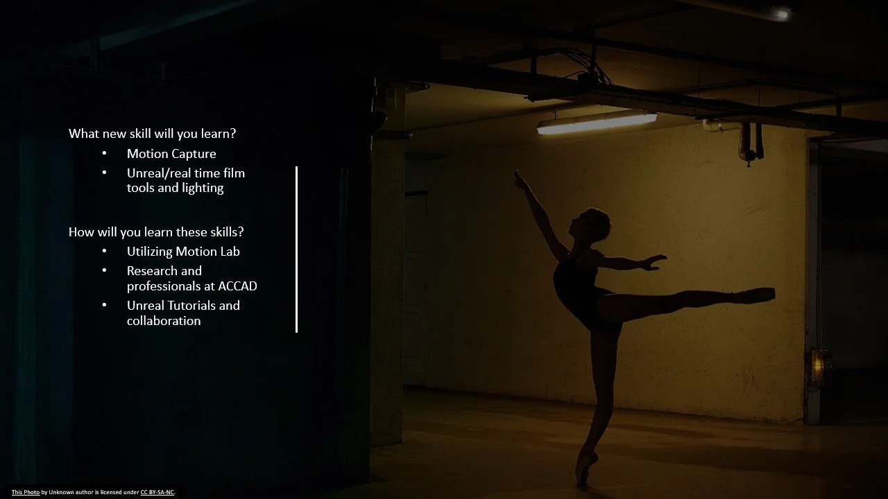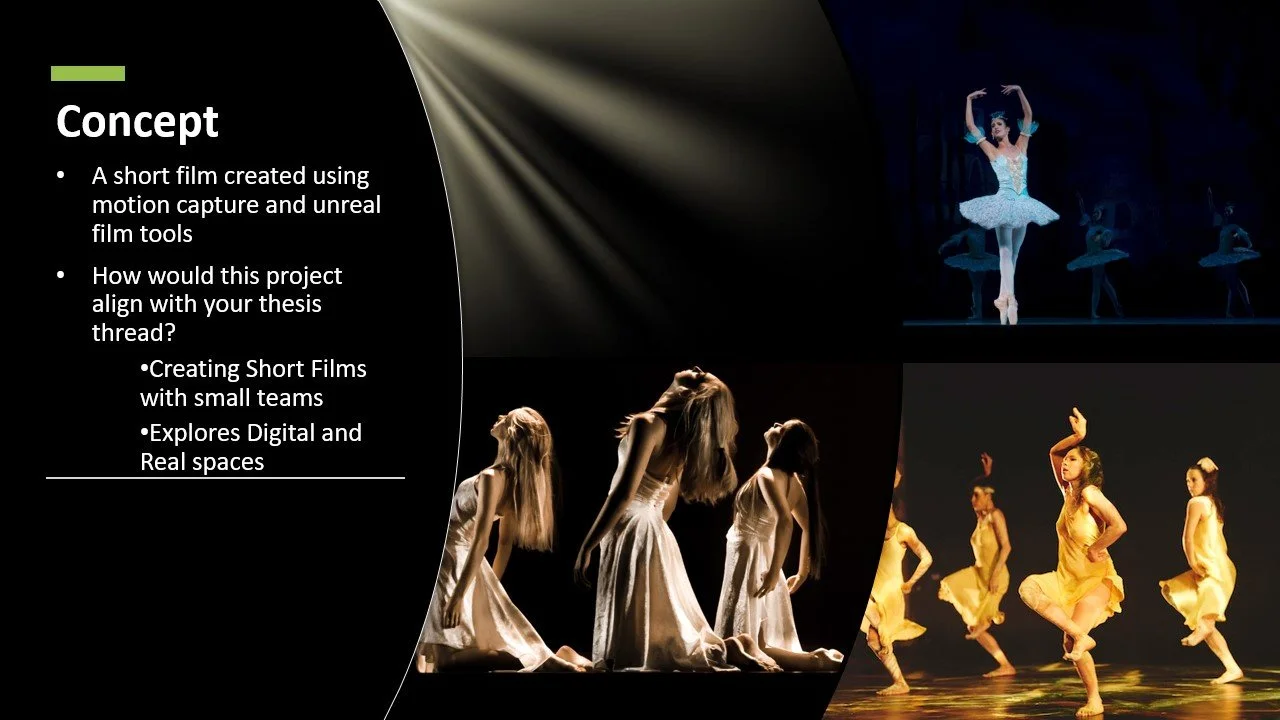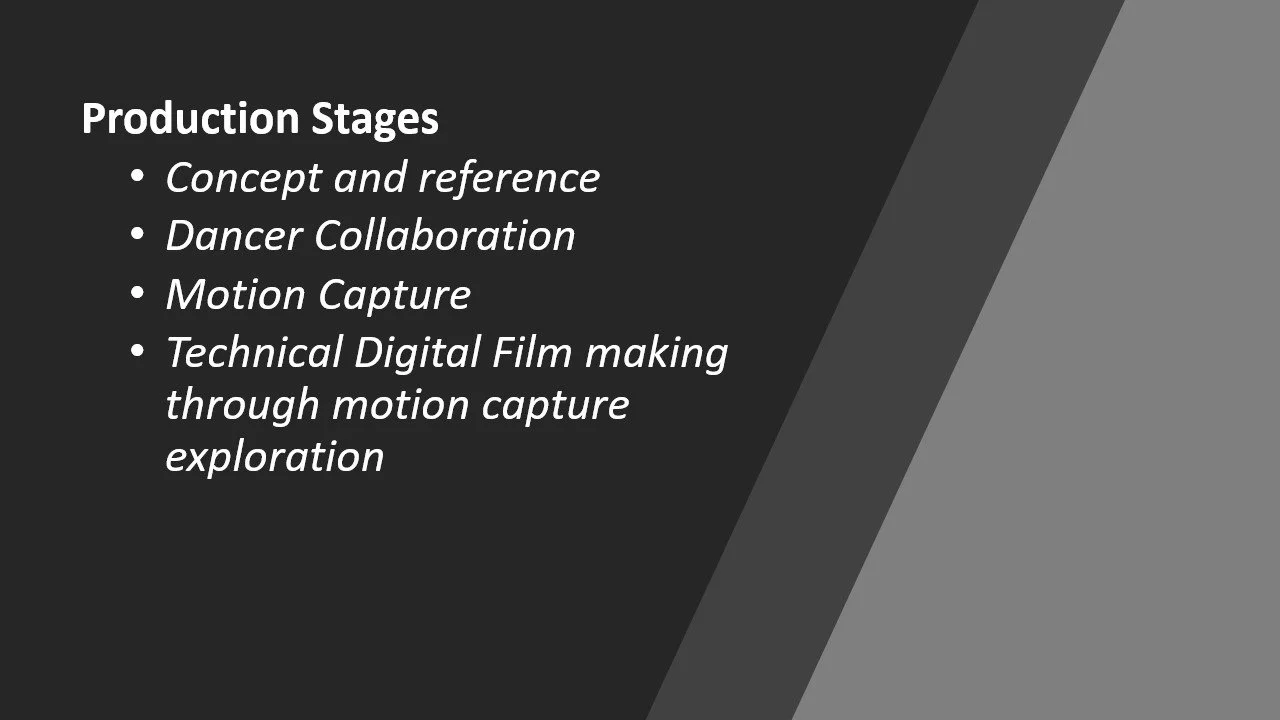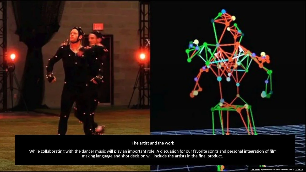 The next stage was to create a presentation detailing our project scope. This presentation also would serve to explain our project when we cast for a dancer. Below are the presentation slides.