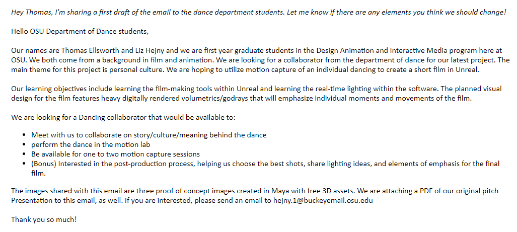 Here is the first draft of the email we sent to the Dance department in search of prospective collaborators.