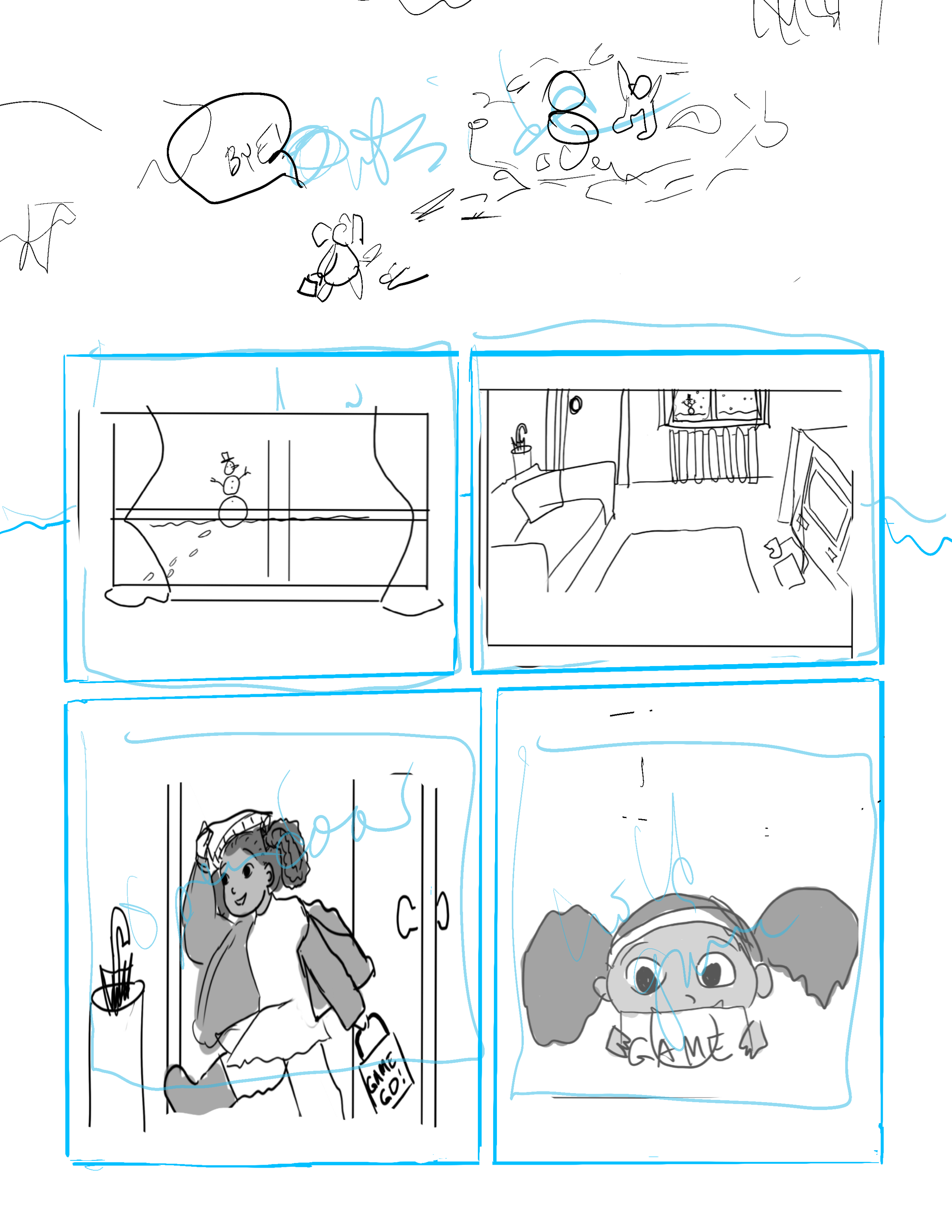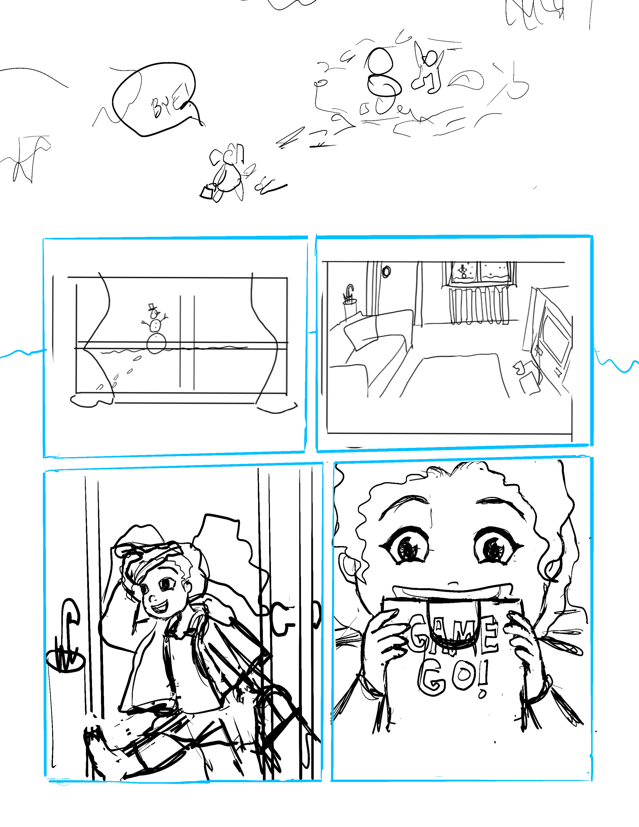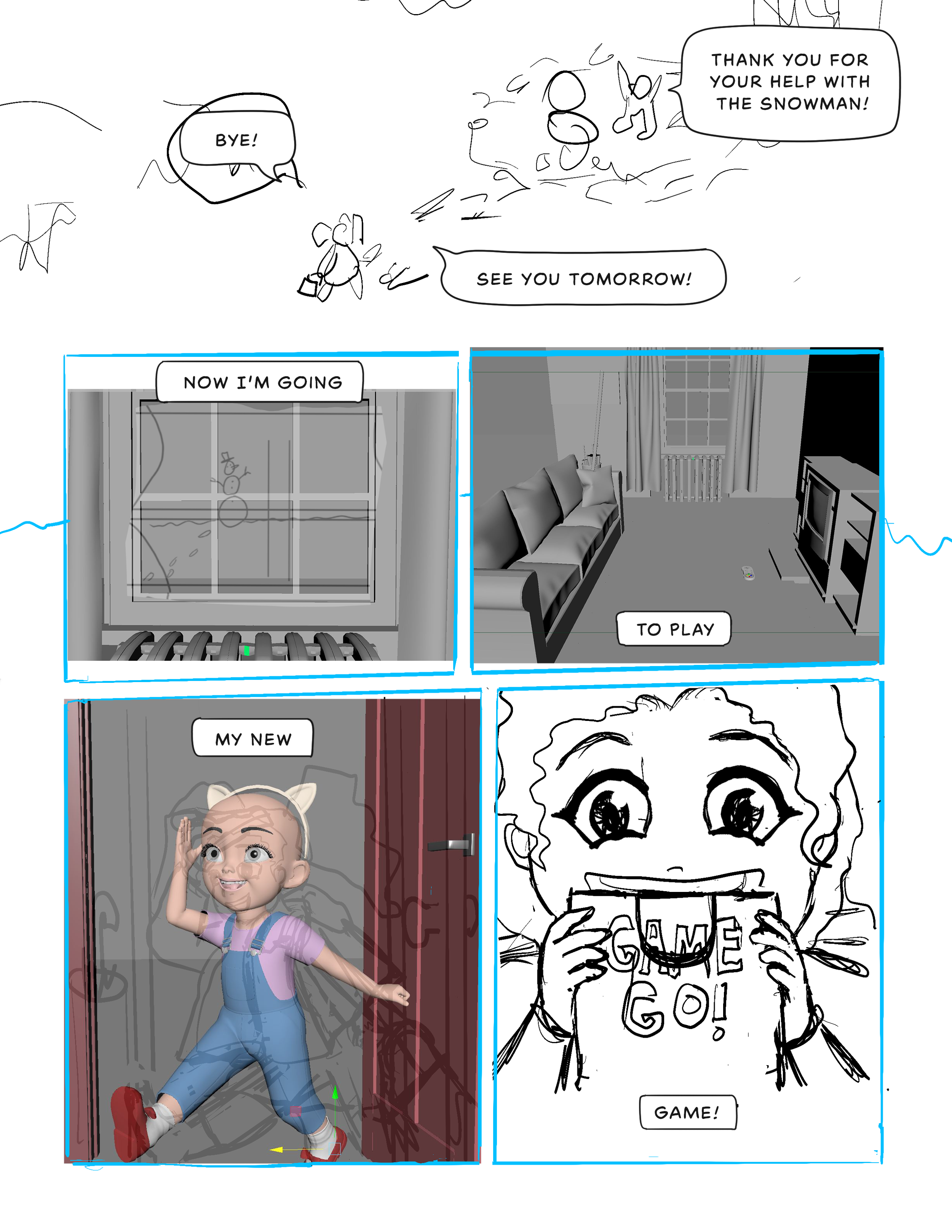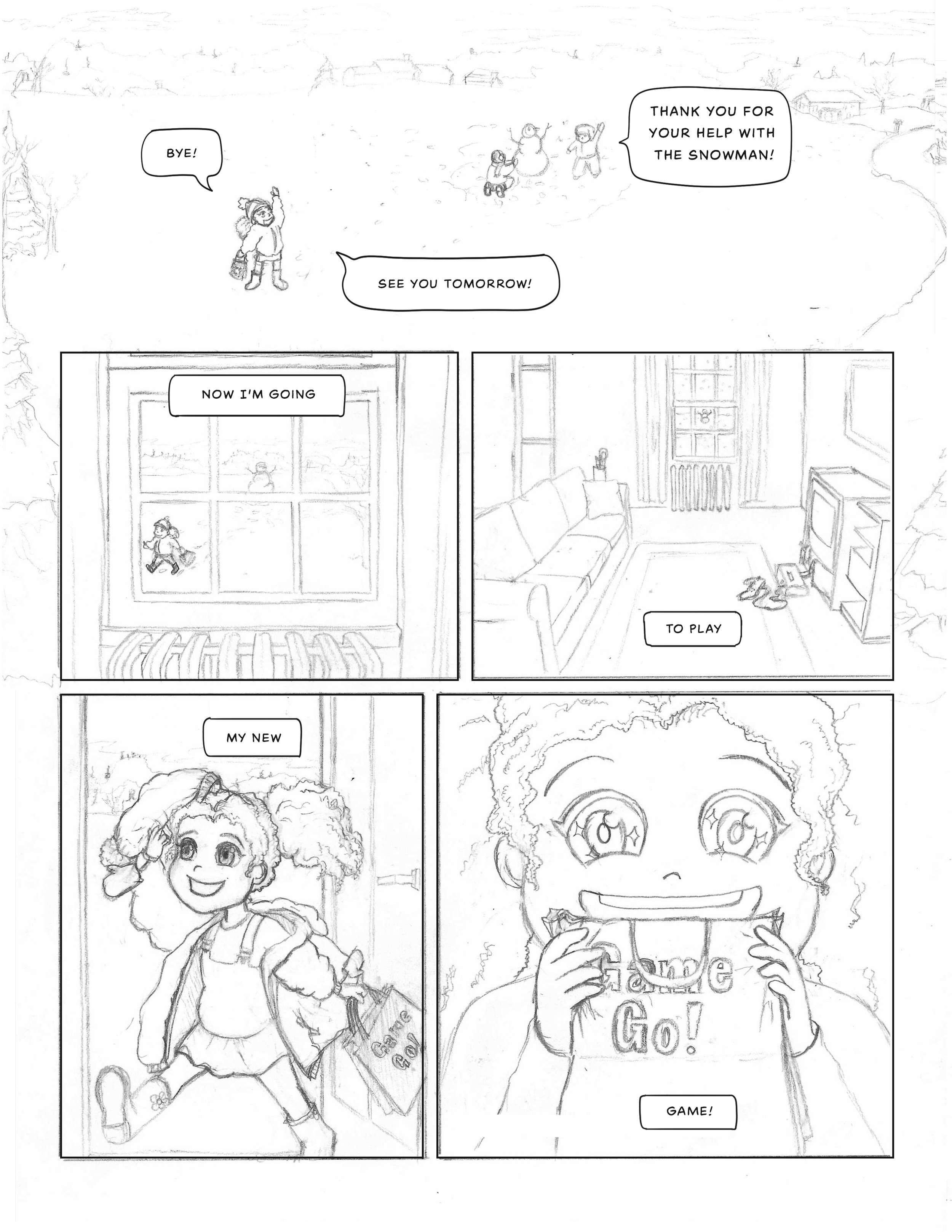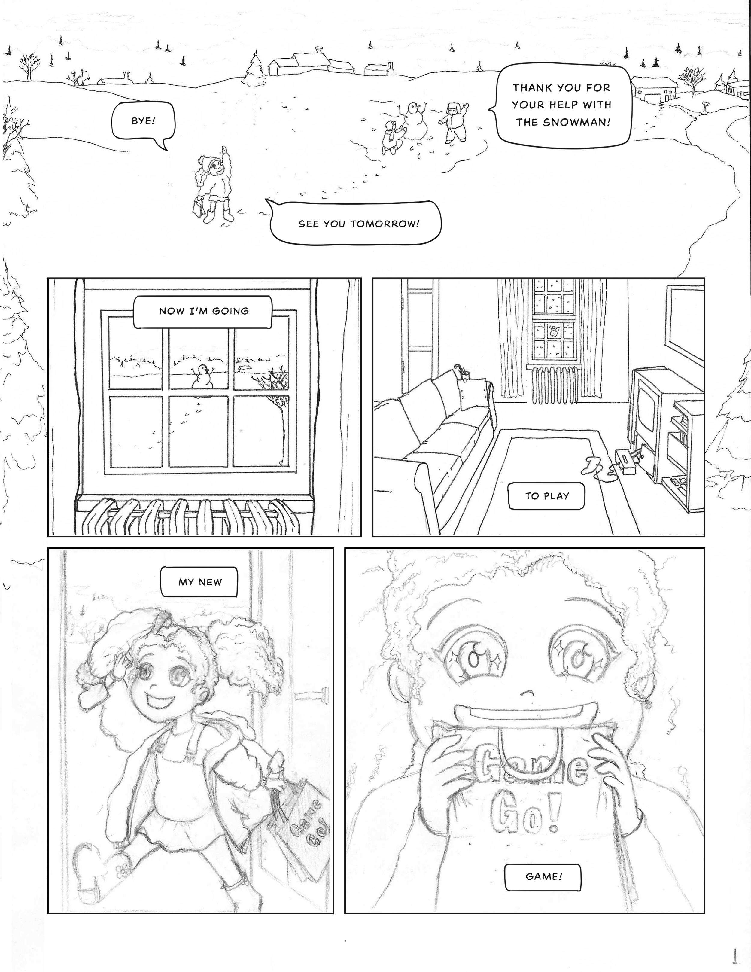 For the very first page of Mya’s Adventure/The gamer braid thread I found reference in the first page of adventure zone for layout ideas. This page lays out the space and then has four panels to introduce three characters and their dynamic. I am introducing one character and one environment. I thought about introducing the living room space but one of the critiques from my second year review was to show that the character does have an active life outside of video games and another critique from Brenda Chapman was to introduce the character’s helpful personality trait early. So showing her helping another person build a snowman outside in the first image can address both of those points while also letting me quickly get to Mya’s love and excitement to play her video game. Following through with a note from a previous meeting I am doing this version in pencil and ink but I am using some digital technology and a lightbox to help in the drafting phases.