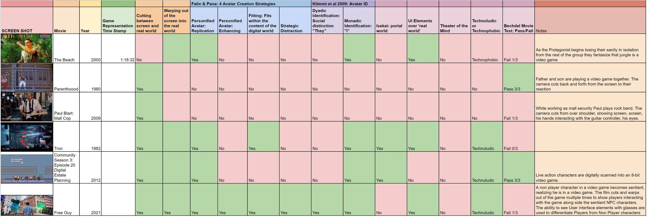 My advisor also reviewed the current state of my writing this week and I started reviewing the suggestions and adding them to my to-do list for next week in my progress report. I started adding my gathered research from films and comics showing video game interaction to a spreadsheet. Here is a link to the current spreadsheet. Here is an example of what the categories and spreadsheet looks like:
