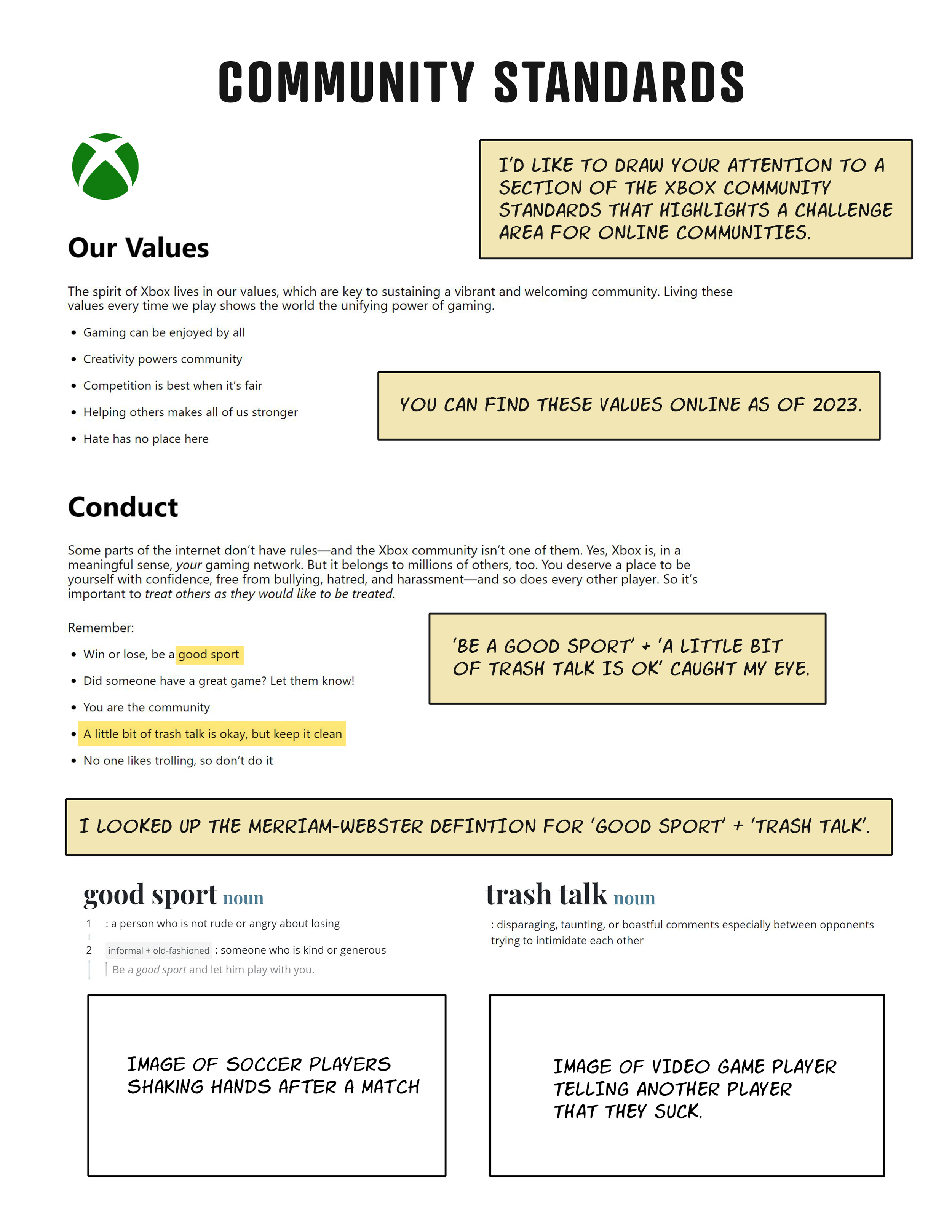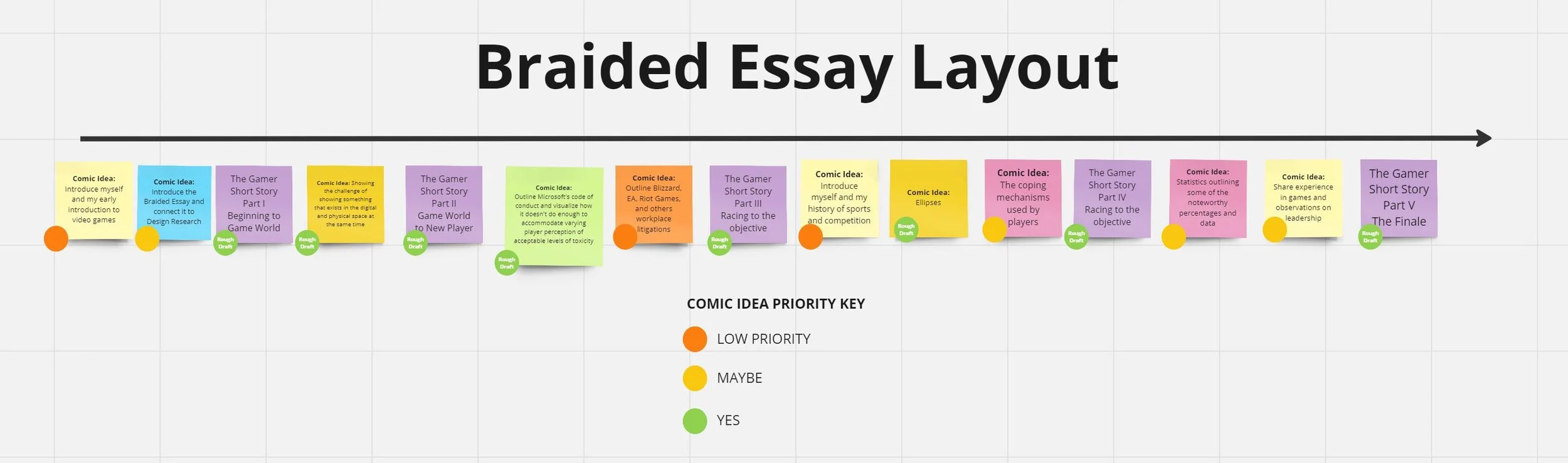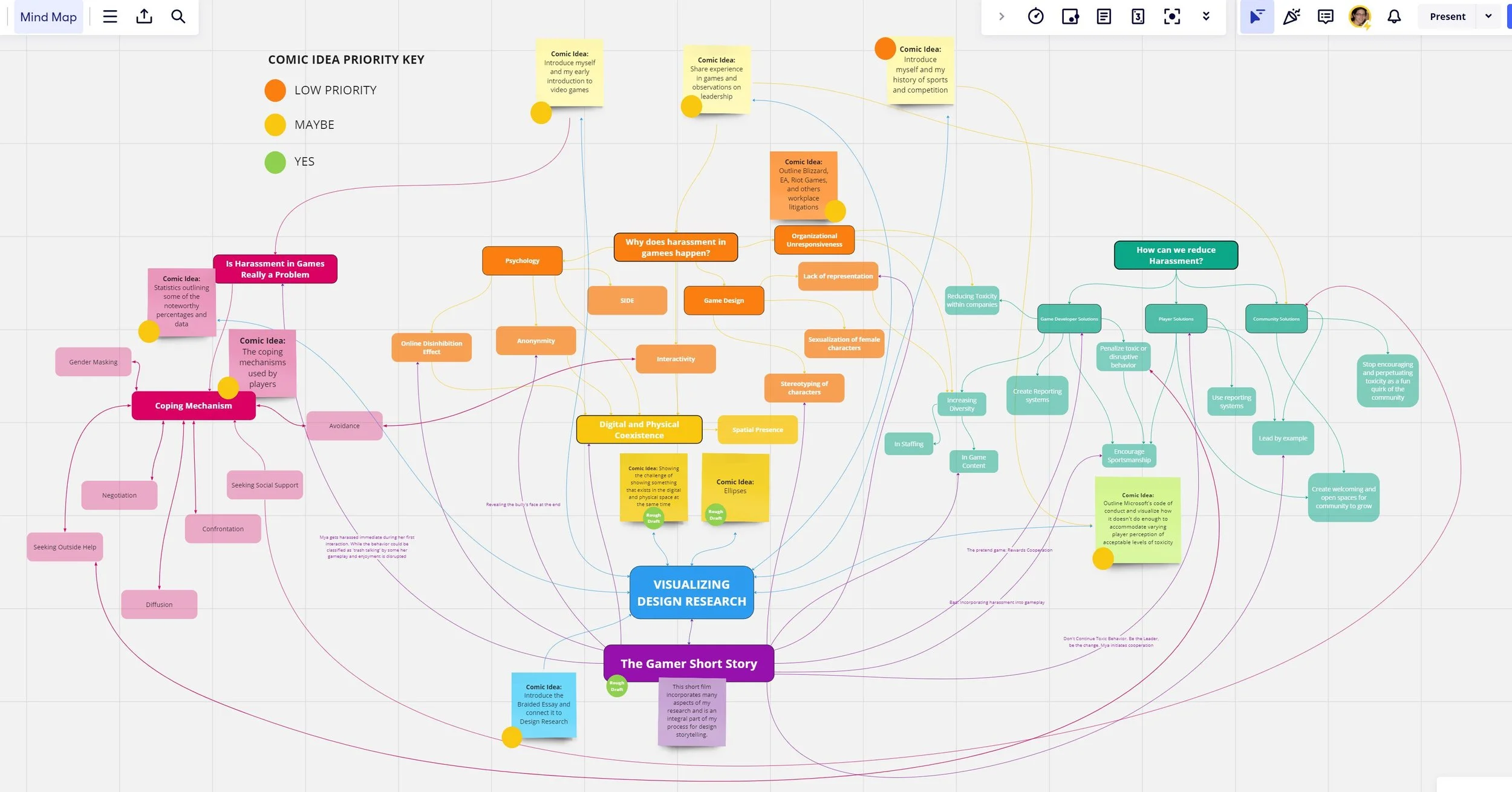 This week I created a rough title for my thesis paper, “Design, Storytelling, and Visual Investigations into Harassment in Games Research”. The title needs some work but whatever title I come up with should encompass my multilayered and connective approach to project based research. My notes from last week: