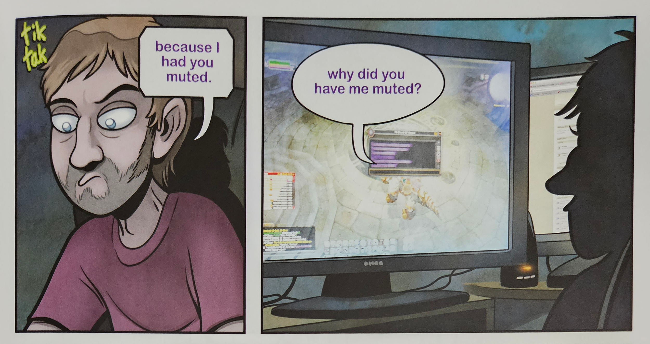 I also wanted to note that small references to gamer culture are present in characters. While the earrings on Kim become a plot point, they aren’t mentioned earlier in the comic but are a reference to the Triforce from The Legend of Zelda series. Including references for gamers helps increase the authenticity of the story and author’s perspective. The title of the comic is not just the name of the guild but also a reference to video game slang with “plox” being slang for “please”. During the time period this game took place players might type, “LF Guild PLOX!1!” Meaning they were looking for a guild to join.