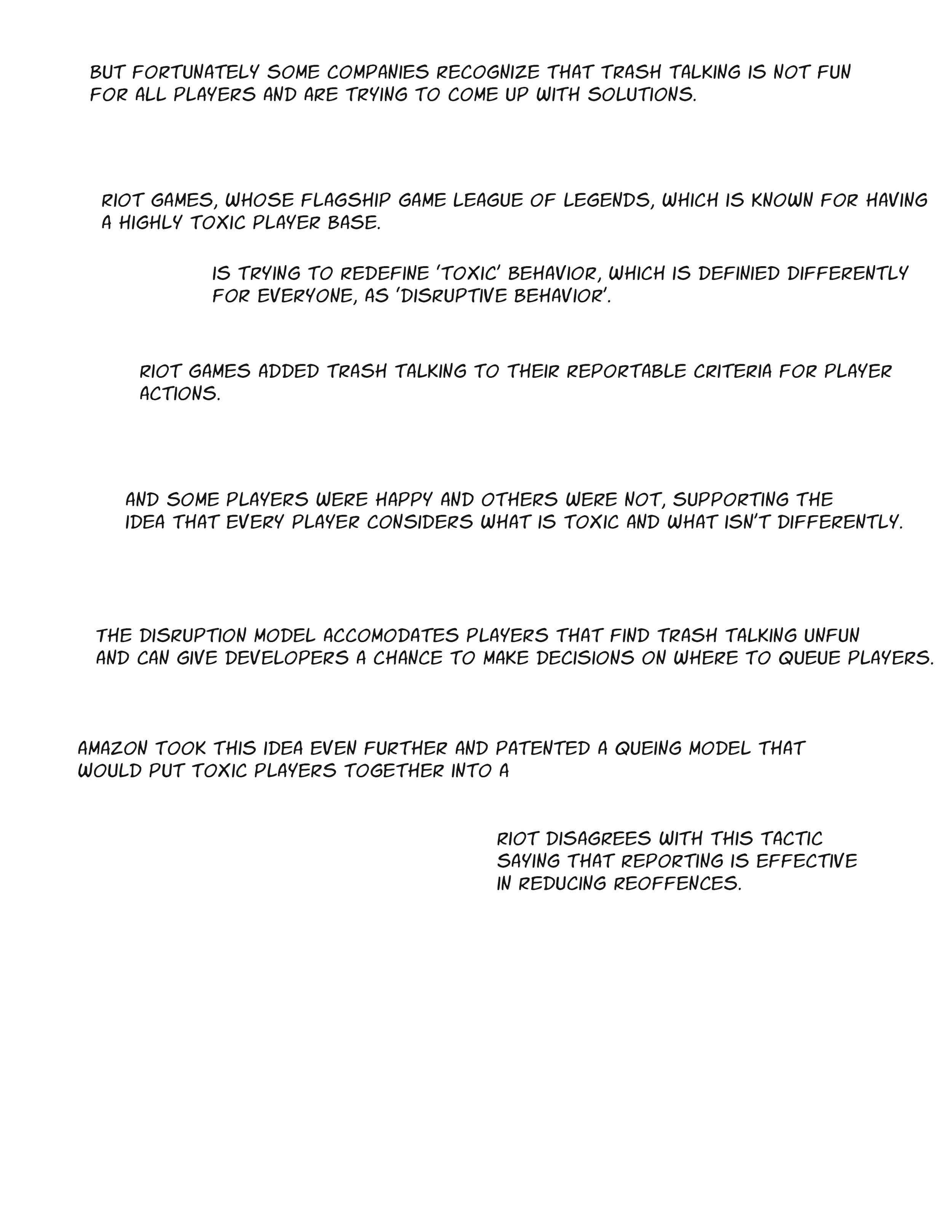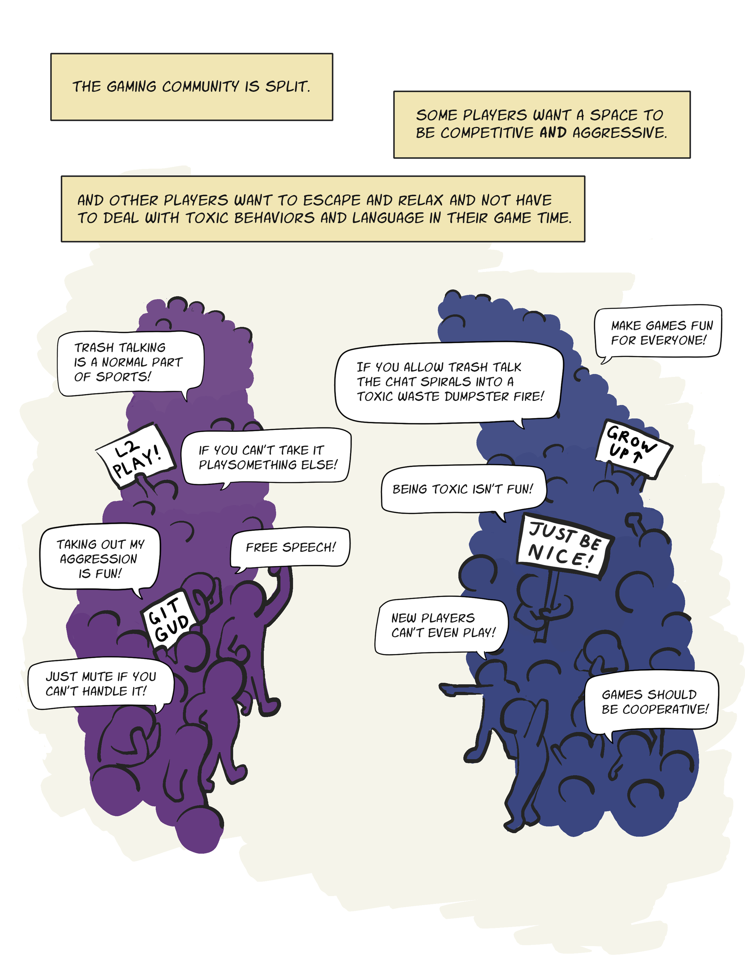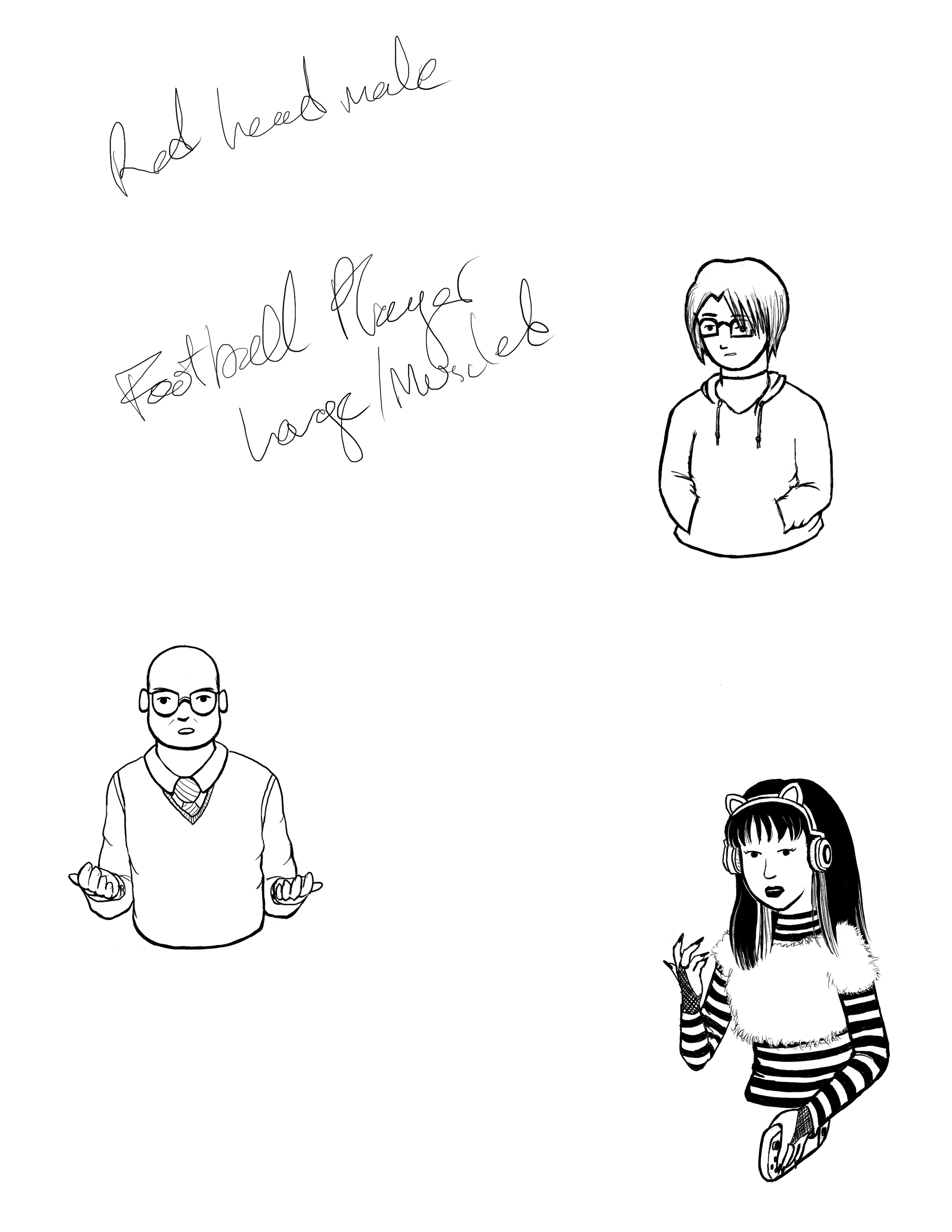 These last few weeks were research heavy but for project I was able to start drawing out the randomized people for the research gathered data on trash talking section of the comic. I plan to draw more people for a number of the quotes from the trash talking player responses. I plan to do characters that are random but I think I should leave the gender of the participant the same.