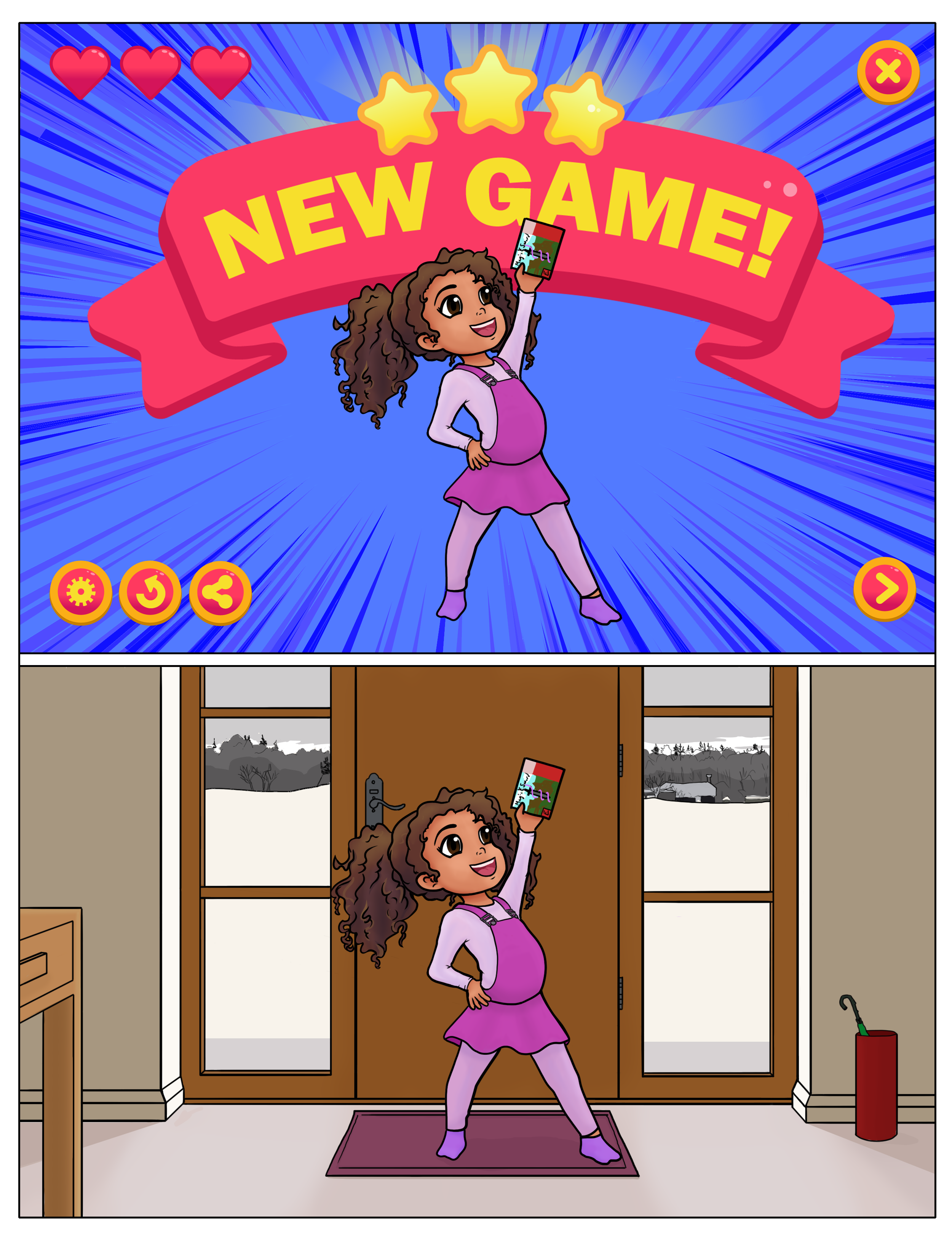 You could have fun with the couch scene to emphasize her energy. have her bounce from the back to the couch to the floor and add other flourishes to show how much energy and excitement she has to play the new game.
