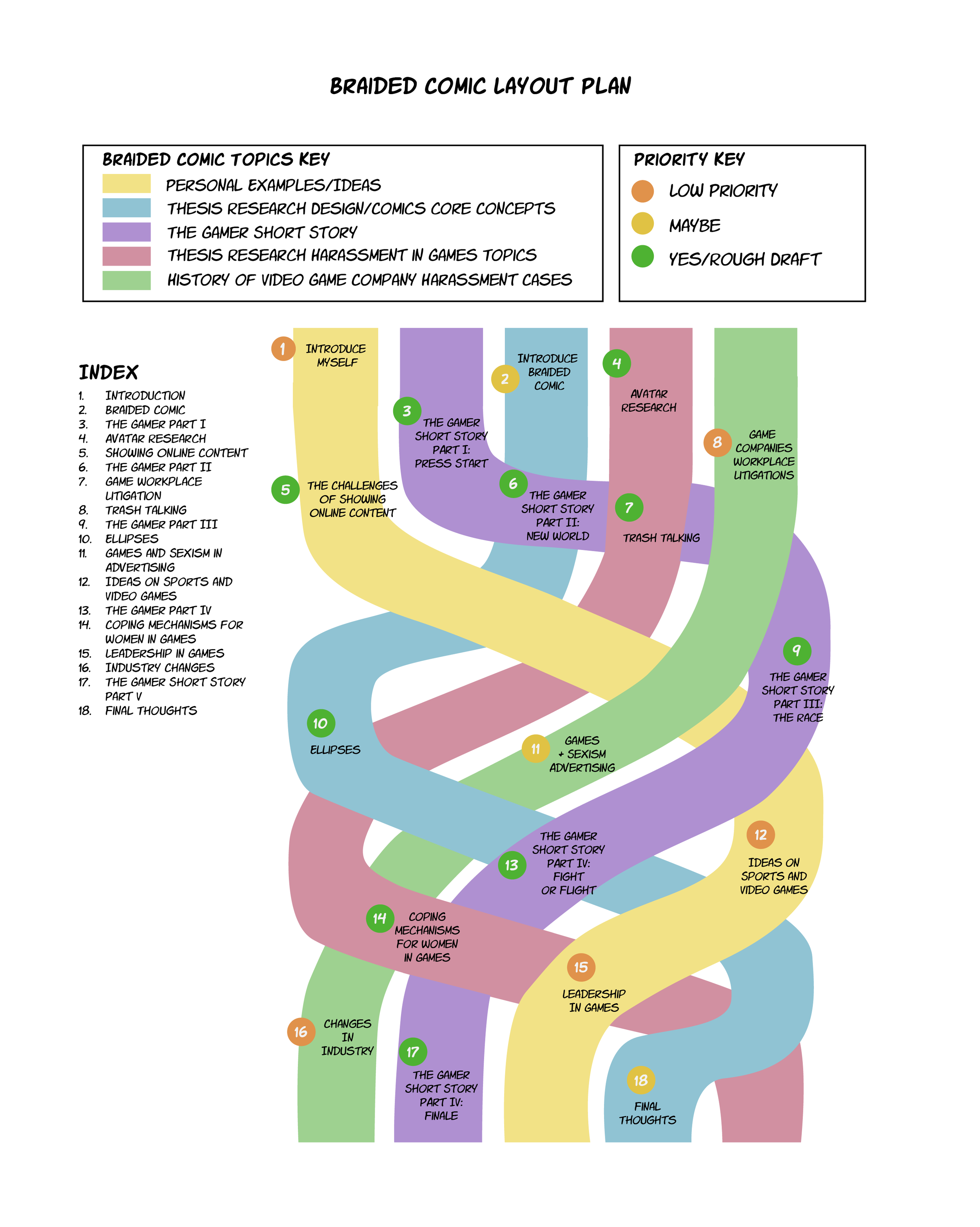 For the presentation I spent the most time designing the visual for the braided essay to help share my research plan. In this visual I am conveying the thread of topics I am weaving together as an index for the different comics I am putting together in this braid.